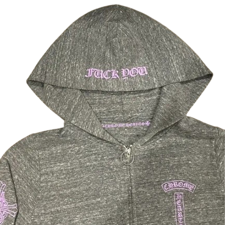 RARE Chrome Hearts Floral Cross Pink Logo Zip Up Grey Hoodie